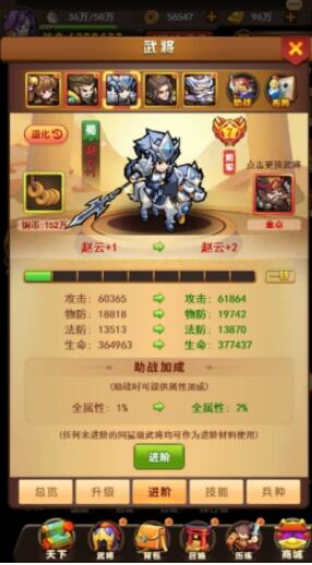 消耗未进阶的同星级武将对目标武将进阶可全面提升目标武将的属性,当武将进阶到达9阶后,可进行转生。