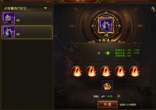 装备强化功能系统,可以通过消耗数量的【奇门之晶】升星材料和【银两】提升装备部位星级,升星后可获得成吨的人物角色属性加成,同时达到指定的星级数可激活装备部位的特殊强力技能,不同部位的装备会有不同的技能效果。