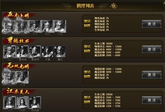 将魂羁绊组合玩法,玩家获得将魂可点亮将魂图标,收集组合内的需要的将魂即可激活羁绊,可获得额外海量的属性加成,羁绊属性提升所有出战的将魂属性,失去将魂不会影响羁绊内将魂的点亮状态和羁绊激活效果。