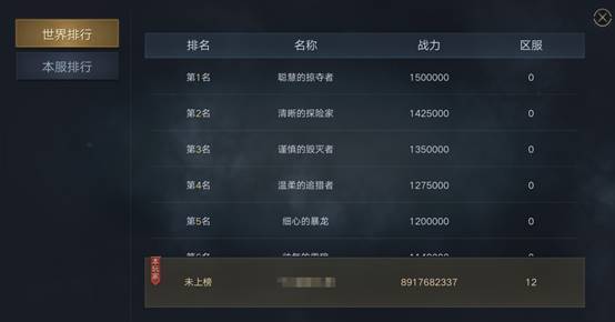 点击左侧的“排行”按钮,可以看到世界排行与本服排行,可以看到榜上高手的战力和所属区服。
