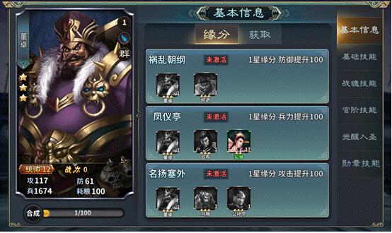 缘分中需要较多的12统的武将,解锁难度较大,也体现出他自身非常强力,所提升属性三基础属性均有,可酌情考虑逐步进行解锁提升。