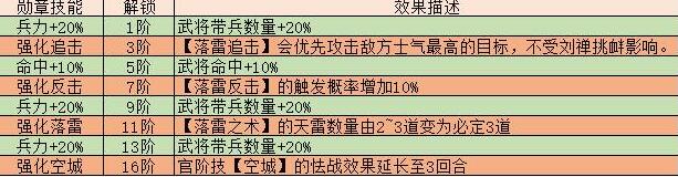 ①【落雷追击】强化后会优先选择敌方士气最高的武将进行攻击,且不受挑衅影响,随著技能的提升(增加触发减士气概率),被命中的武将,将无法释放主动技。