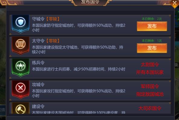 4、 太守可以在太守城池发布太守令,在2小时内提高建设城池获得的功勋;