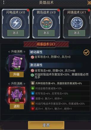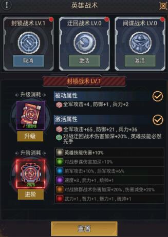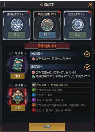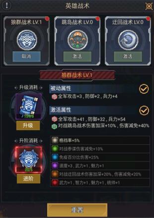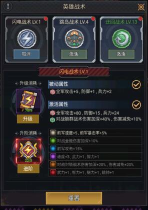 开启战术后,即可在英雄界面选择战术进行激活、升级以及升阶。
