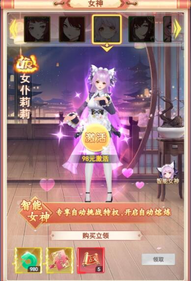 UR女仆莉莉是游戏中的一位智能女神,她具有自动挑战和自动熔炼的能力。非常实用的能力,可以帮助玩家自动挑战BOSS、自动熔炼多余不必要的装备,能让你的背包更轻松。购买UR女仆莉莉可以让玩家在游戏中更加轻松地进行挂机,提高收益和战力。