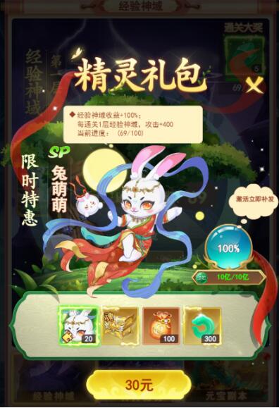 经验副本精灵礼包是游戏中的一种特殊礼包,购买后可获得SP精灵-兔萌萌,可以帮助玩家在经验副本中获得更多的经验奖励。