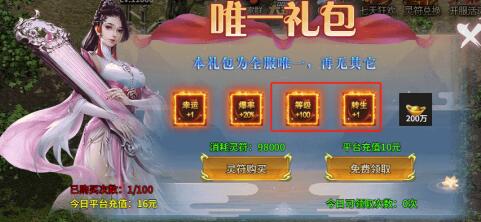 方式四:仅适于开服第一天,“唯一礼包”领取后,会变成如下礼包,每充值10元即可领取一次,上限100次,当天可让你突破100转+10000级,进入第10大陆。