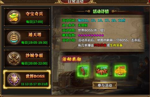 活动介绍:活动开启后,地图内刷新一只BOSS,击杀BOSS后有几率爆出终极装备或生肖装备