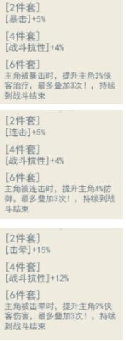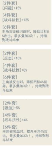 3、每种套装效果都分为:2件套、4件套、6件套。分别提供加成:战斗属性、全战斗抗性、特殊技能效果。套装效果只在战斗中生效。