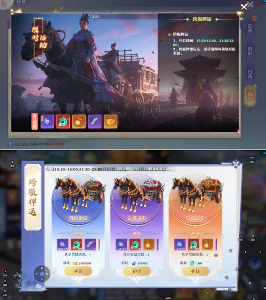 3. 跨服押镖玩法,活动期间可以领取双倍奖励;