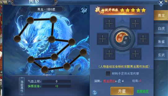 四象系统有青龙、白虎、朱雀、玄武,每个可穿戴副装和神装,可通过每天的演武活动获取,神装有特殊套装效果,一定不要错过。