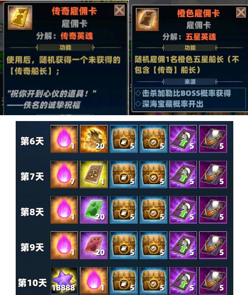 第5天:传奇英魂*1、深海宝藏*10、贸易小宝箱*5、副本罗盘宝箱*5、紫色船只卡*5、紫色船长卡*5