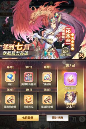 开服第二天通过签到可以获得三系自选英雄礼包,登录七天更可以获得华夏核心英雄花木兰,记得要上线领取!