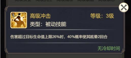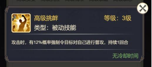 点评:触发挑衅可以强制让对方进行普攻,提供一定的控场能力,相比【冲击】虽然概率较低,但没有触发条件,适合配合拥有范围伤害技能的坦克或者辅助类英雄使用。