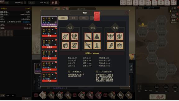 Ø 在游戏功能面板点击伙伴-阵容后,在总览界面可以显示选中伙伴装备的兵器、法宝、暗器,当前战力、基础属性、特殊属性、技能信息。