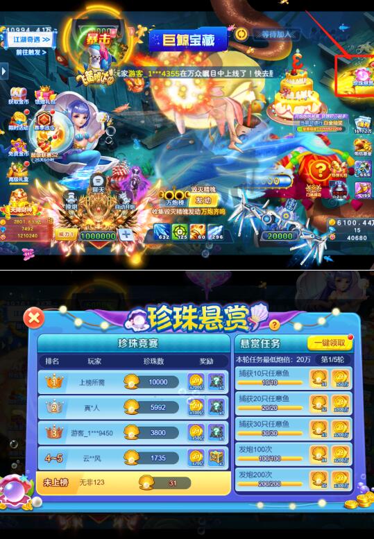 1.悬赏期间可在任意渔场捕获小蚌精来获得悬赏珍珠,炮倍越高掉落的概率和数量越大