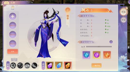 1、天神打开主界面包括升级功能,可以通过天神元魄升级天神等级,提升主角属性。