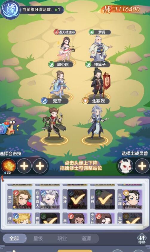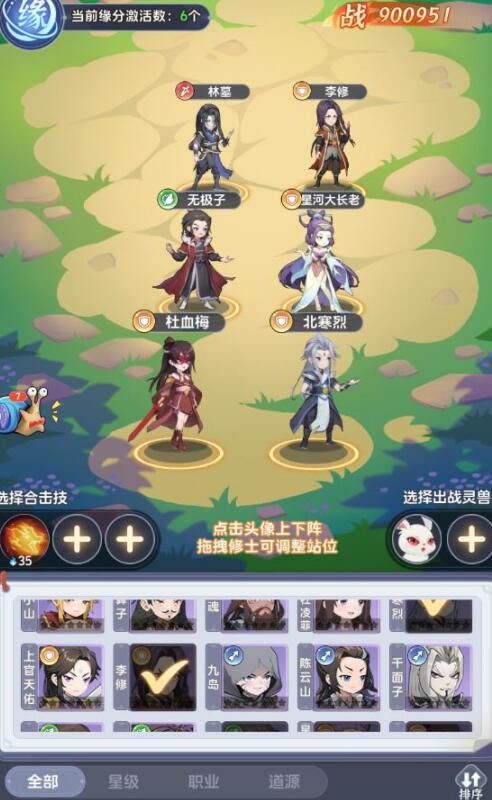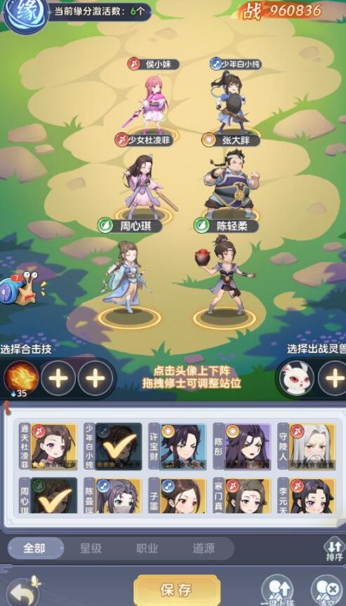4女2男组合,侯小妹和杜凌菲作为灵溪宗的颜值门面,一同上阵自然是有她们的独特之处,两者激活的列阵缘分能为我方女性修士减伤,虽说伤害差了那么一点,但是稳定磨血和拉扯才是这配队的关键。