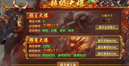 超级大爆:击杀等级、封魔、真言、神灵领主boss有概率触发,触发后必定进行5爆,有开关可控制开启关闭