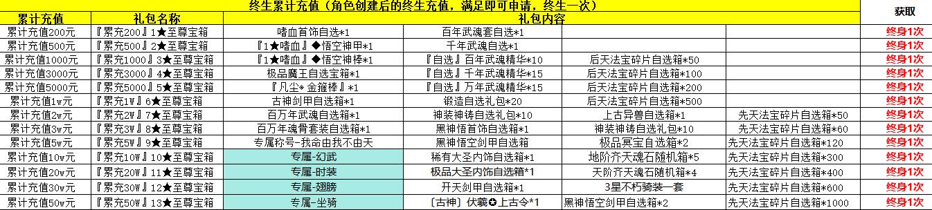 活动规则:从创角时开始计算,总累充返利每个档次奖励终身仅可领取1次