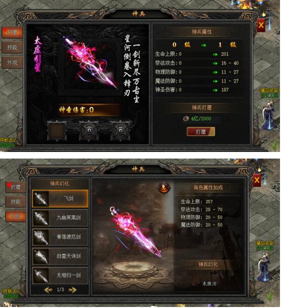 神兵可以同时佩戴3把,并且提供幻化支持外观更变。
