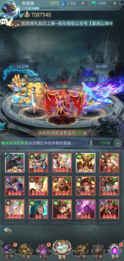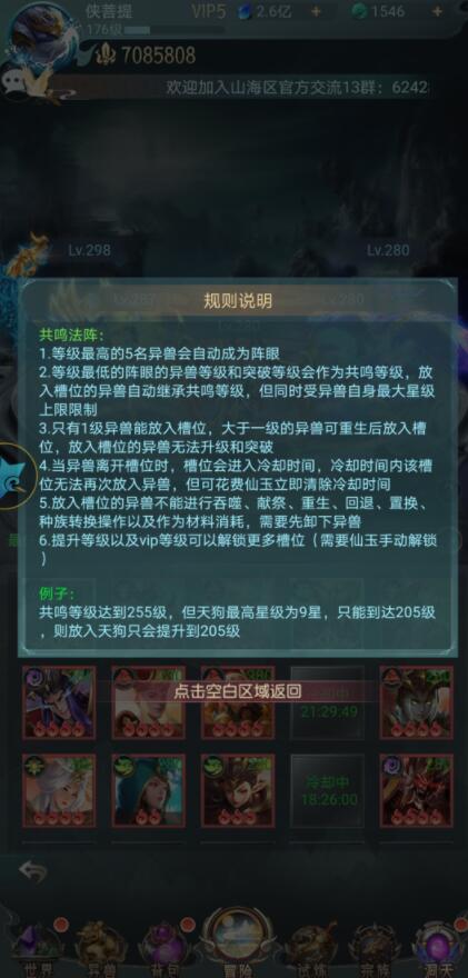 在山海世界有一个机制,就是玩家达到一定等级后开启共鸣法阵,详细规则见图,简而言之就是选取5个最高等级的异兽做阵眼,共鸣异兽的等级为这五个异兽中最低的等级。