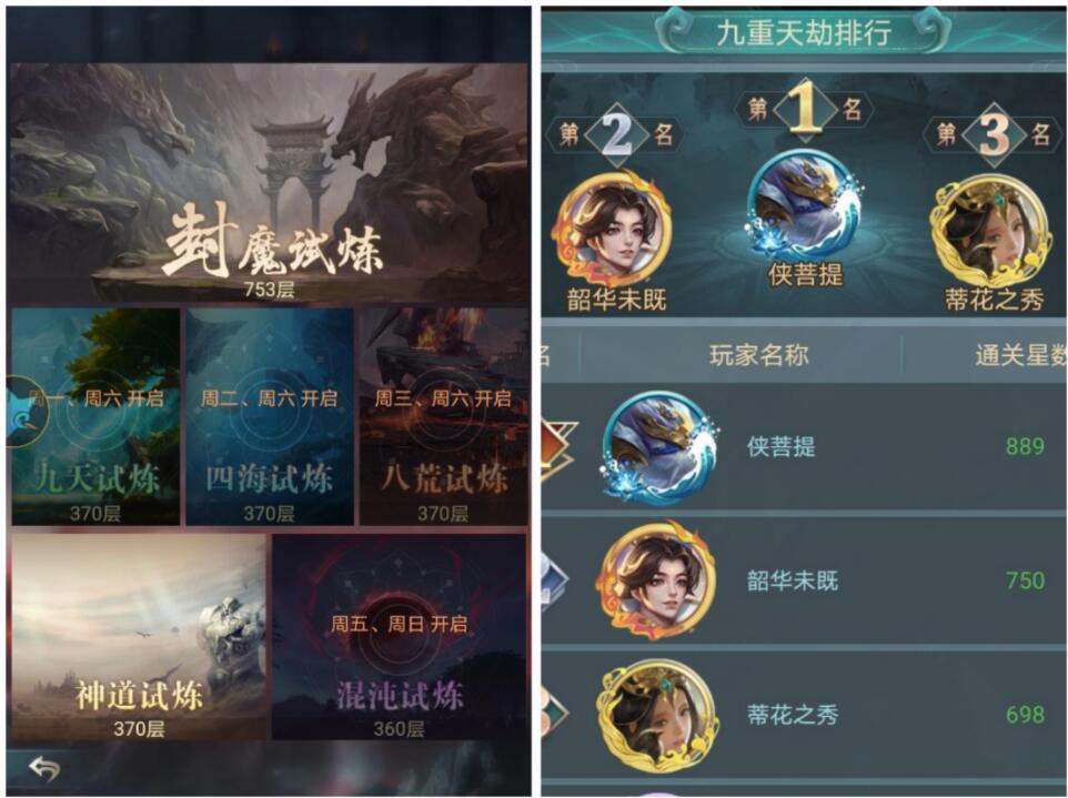 我的共鸣主要是基于封魔种族试炼和九重天劫。封魔试炼后期需要每个种族5个种族异兽,可以优先每个种族培养3个然后再慢慢培养其他的,也就是每个种族先共鸣3个。而九重天劫有时候需要同时出阵4个肉盾,或者4个刺客,或者四个八荒,或者四个辅助等等。基于此,就需要将之前每个种族选择的3个异兽按属性分配好,尽量达到九重天劫的要求以获得3星通过,不是的话之后还得浪费次数来再次通关,下图是我的我的九重天劫和封魔种族试炼通关情况。