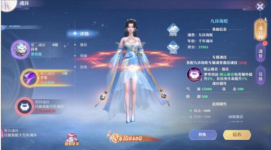 开启魂环功能获得魂环,额外增加属性及外显。魂环年份越高,属性加成越高,外显越强,彰显自身实力。