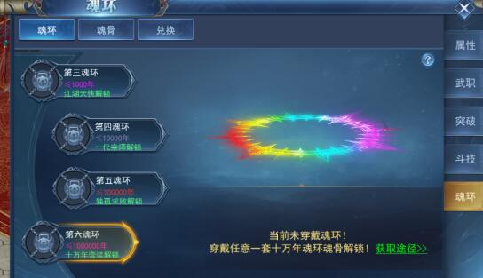 完成侠客行达到对应等级可解锁魂环,魂环分为十年、百年、千年、万年、十万年、百万年共六种品质,主要通关野外boss获取,稀有boss爆率更高。装备全套魂环魂骨可激活超强技能,不通魂环魂骨有不同的技能,注意要选择最适合自己的。