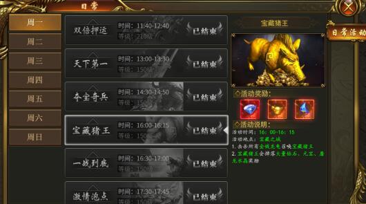 活动说明:角色150级以上可参与,前往宝藏之城击杀所有金钱龙龟然后召唤猪王,击败可以获得大量奖励。