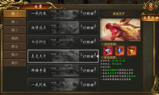 活动说明:角色150级以上可参与,前往御龙圣地击杀真龙BOSS可获得真龙身份,击杀真龙玩家可获得真龙身份,真龙玩家每10秒可获得持续奖励,结束后根据排名发放奖励。