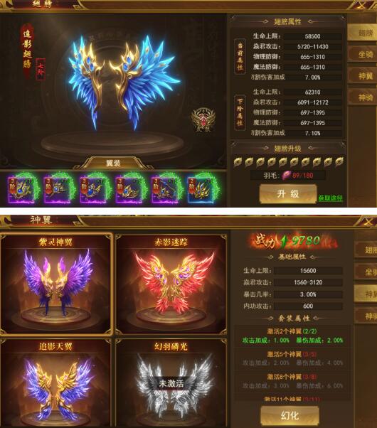 3、激活更多的神翼可以获得属性加成,并可随意幻化
