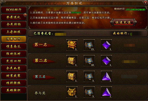 【活动说明】:活动期间,累计消费达到300000元宝即可参与充值排行活动,排行前三名的玩家可获得专属奖励,其他达到充值条件的玩家可获得参与奖,活动奖励在活动结束时以邮件的方式进行发放