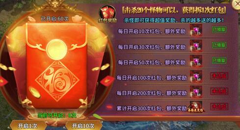 该玩法很简单,每击杀20只怪,即可获得1次红包开启机会。一般是累计10次在统一开,这样也便于我们安心挂机。