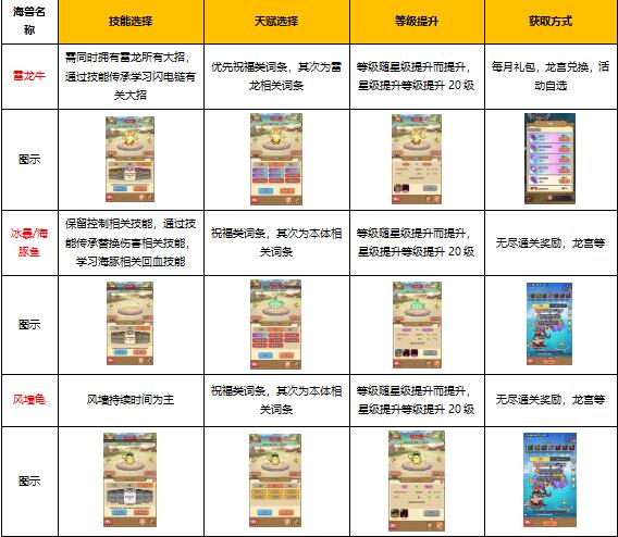 海兽的培养是为了后续神兽的出场奠定基础,海兽的等级决定神兽等级,二者相互绑定,所以海兽的培养只有两大重点,分别是等级和天赋以及技能的选择。等级提升需要足够的海兽经验,海兽经验的获取方式主要有,死神轮盘,每日/周/月海兽礼包。海兽天赋首选祝福类词条,其作用是为船长神器提供加成,增幅类词条只会为海兽自身加成。其中推荐且实用的海兽有以下:雷龙牛,冰暴鱼,海豚鱼,风墙龟。海兽玩法中有两个特殊之处,海兽继承功能以及技能传承功能。海兽继承目的是将海兽的天赋转移至另一只海兽,技能传承以消失本体海兽为代价学习指定技能,可以在海兽技能页面替换技能,会受到海兽等级限制以及学习技能次数限制。